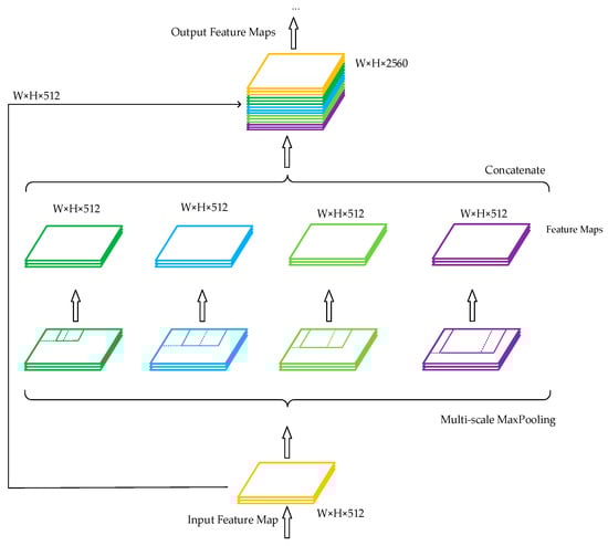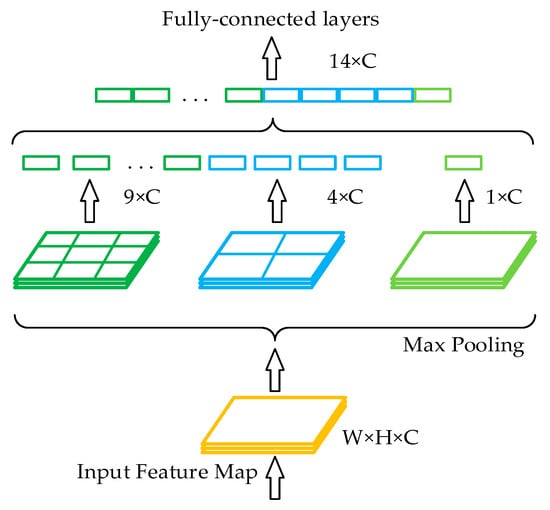In the traditional structure of a convolutional neural network, a fully connected layer is connected after the convolutional layer. Since the number of features in the fully connected layer is fixed, the size of the input image on the input side of the network is also fixed. In practical applications, the input image size is typically inadequate and must be cropped and stretched, which frequently distorts the image. Spatial pyramid pooling (SPP) [] can generate fixed-scale features by processing input images of arbitrary sizes or scales and is robust to changes in the size and shape of an input image. Its structure is shown in Figure 4.
