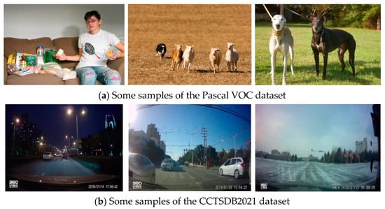 The original YOLOv4-tiny model’s anchor boxes were obtained by clustering the COCO dataset [] and the Pascal VOC dataset []. By analyzing these datasets, we found that the targets in these datasets were more different in size and shape from those in the traffic sign dataset, and the background of the traffic sign dataset was more complex. As a result, the original anchor box size was unsuitable for Chinese traffic sign detection task and may harm the model’s training results. Figure 7 shows samples from the Pascal VOC dataset and the CCTSDB2021 dataset.