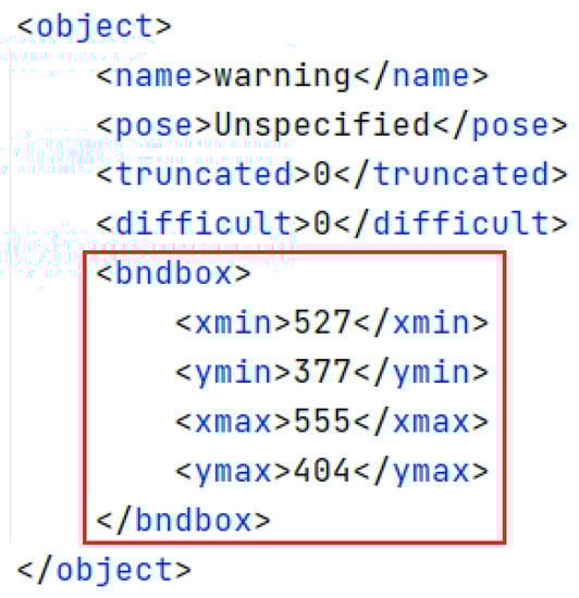 The CCTSDB2021 dataset was initially analyzed, and Figure 8 shows the annotated information of the samples in the dataset. The data for the clustering algorithm are in the annotated red box in Figure 8. Therefore, we give more detail about the data in the an-notated red box. The bndbox tag specifies the location of a traffic sign within an image, the xmin value specifies the horizontal coordinate of the upper-left corner of a traffic sign bounding box, and the ymin tag specifies the vertical coordinate of the upper-left corner of a traffic sign bounding box. The xmax tag specifies the horizontal coordinate of a sign’s lower-right corner. The ymax tag specifies the vertical coordinate of a bounding box’s lower right corner.
