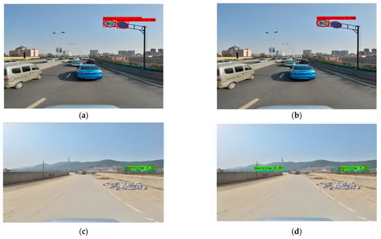 The TSR-YOLO algorithm was tested with YOLOv4-tiny in four complex environments selected from the CCTSDB2021 dataset, including a well-lit environment, a night environment, a rainy environment, and a snowy environment. The test results are depicted in Figure 14, Figure 15, Figure 16 and Figure 17, where “prohibitory” represents prohibitive traffic signs, “warning” represents warning traffic signs, and “mandatory” represents mandatory traffic signs. (a) and (c) represent the detection results of TSR-YOLO, whereas (b) and (d) represent the detection results of YOLOv4-tiny. Figure 14 shows that the method described in this paper worked well in places where there was enough light. In the first figure, the TSR-YOLO algorithm’s detection accuracy for prohibitive traffic signs was 100% and 58%, while YOLOv4-tiny’s detection accuracy was 98% and one of the traffic signs was not detected. The algorithm shown in this study was 14% more accurate than YOLOv4-tiny’s detection accuracy, and the improvement was observable. The second figure shows that the TSR-YOLO algorithm and YOLOv4-tiny algorithm detected 100% of the warning traffic signs, but the YOLOv4-tiny algorithm incorrectly identified the background as a traffic sign. The algorithm in this work had more advantages in an environment with ideal lighting conditions. In a night environment, the detection results are shown in Figure 15.