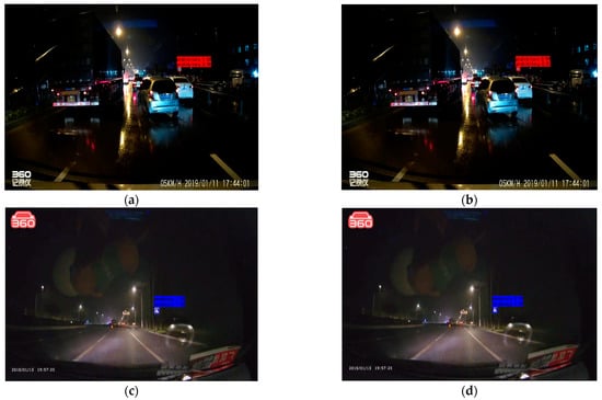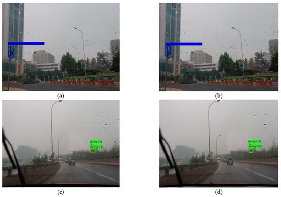 As shown above, the TSR-YOLO algorithm had a higher detection accuracy in the nighttime scenario than the YOLOv4-tiny method. However, the detection results of the two methods did not differ much, with an error rate of less than 3%. Figure 16 displays the results for detection on rainy days.