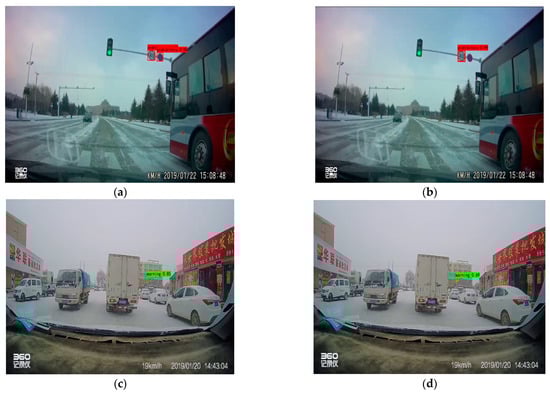 Comparison results of different algorithms in snowy weather, where (a,c) are the results of TSR-YOLO, (b,d) are the results of YOLOv4-tiny.