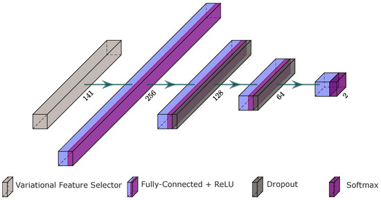 Figure 3. As can be observed, the variational feature selector was just used in the first layer after the input. Two dropout layers were added in the following layers to mitigate overfitting problems, in which a