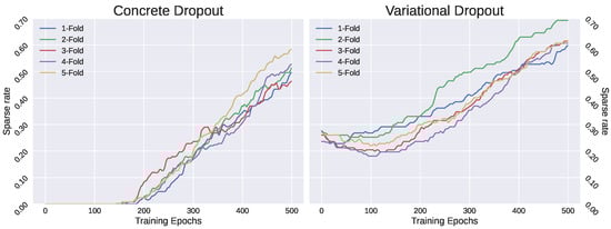 Figure 4 shows the sparse rate during the training phase of the respective model in each iteration of the cross-validation. As can be observed, concrete dropout obtained a sparse rate of around 50%, and the variational dropout approach obtained a sparse rate of around 60% in most of the cases. This means that, in general, more than half of the features were considered irrelevant. Additionally, variational dropout started to become sparser in an early epoch, whereas concrete dropout required a higher