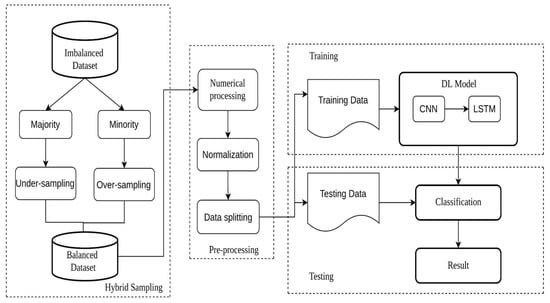 Four experiments were conducted to determine the effect of dataset imbalance. In the first one, CNN-LSTM detected intrusions using imbalanced data. In the second experiment, the data were balanced using undersampling only. The model was trained with balanced data using an oversampling approach in the third experiment. A hybrid balancing technique was used in the fourth experiment, undersampling the majority class and oversampling the minority class. Next, the CNN-LSTM model was used to detect anomalies in the dataset.