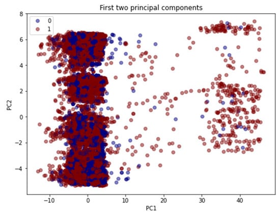 The Morris power dataset is imbalanced, as shown in Figure 3, which shows the class distribution in the dataset. To understand the dataset, principal component analysis (PCA) was used to visualize the data. From the visualization, we can determine whether a clear pattern can be seen and if so, determine which ML/DL model is most appropriate. The output of the PCA can provide a clear picture of the overall dataset. Although PCA reduces the dimensionality of the dataset, hence losing some data. It simply groups together features that are strongly correlated. We need an accuracy of approximately 70% to understand the overall dataset; we do not need to see every street to know the city.