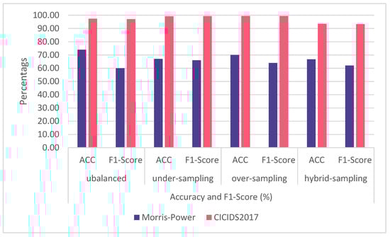 The overall result is shown in Table 15 for the Morris dataset and Table 16 for the CICIDS2017 dataset. Figure 6 provides accuracy and F1-score, and it is clear from the pattern that when using the Morris power dataset, the CNN-LSTM model performs quite modestly. This is due to the dataset’s small size, which is only around 72,000. The outcome may differ if a machine learning algorithm is used. Deep learning techniques, however, need a bigger dataset. The results using the unbalanced CICIDS2017 dataset were satisfactory. When oversampling is used exclusively, the best outcome is obtained. Figure 6 demonstrates that the hybrid sampling method did not produce reliable outcomes. This is due to the dataset being distorted by the removal of records from the majority class and the addition of fake data to the minority class.