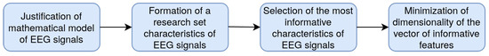 It is known that the procedure for processing EEG signals in BCI systems can be divided into five main stages (see Figure 1): signal registration, preprocessing of signals, evaluation of signal characteristics, classification (recognition) of signals, and computer interaction.