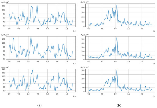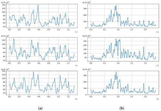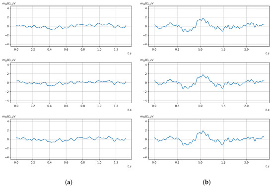 In a study [45], the cyclostationary correlated (periodically correlated) random process, as a mathematical model of EEG signals, for use in brain–computer interface design was justified. Within this mathematical model, moment functions of the first and second orders and the bispectral power density function of the EEG signals were used as informative characteristics. Often, for estimating the probabilistic characteristics of EEG signals, methods of averaging by an ensemble of realizations are used for nonstationary random processes with an undefined probabilistic structure. For example, the EEG signal was presented through an ensemble of its implementations [1], where the authors proposed using the results of the integration of EEG signals during each second as informative characteristics.