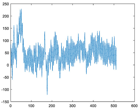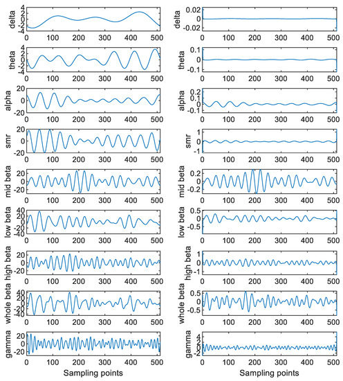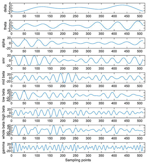 Figure 4 shows an example of a sample of the EEG when Danny is conducting the drawing activity under the concentration state. It is well known in the EEG community that the useful information of the EEG is localized in the frequency band between 0.5 Hz and 49 Hz. However, it can be seen from Figure 4 that there is a high-frequency noise above 50 Hz contaminating the EEG. Hence, it is required to remove this high-frequency noise. Although different IMFs are localized in different frequency bands, the IMFs have leakages in the frequency domain because these IMFs are not bandlimited. Moreover, as the mode-mixing phenomenon occurs [21,23], the obtained IMFs are not the corresponding brain waves. To address this issue, the FFT approach is applied. That is, the FFT is applied to the EEG and those coefficients higher than 50 Hz are set to zero. As the remained coefficients are bandlimited, this is equivalent to applying the ideal lowpass filtering to the EEG. In this case, the high-frequency artifacts are eliminated. Moreover, the corresponding brain waves can be extracted directly via the FFT approach.