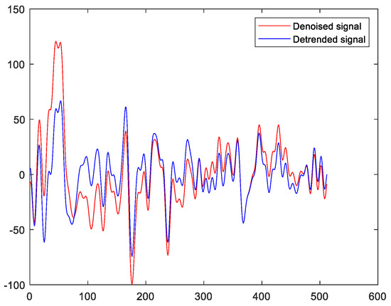 It is worth noting that the eye and muscular activities would introduce drift to the acquired EEGs. In fact, this drift can be characterized by the underlying trend of the EEGs. On the other hand, the EMD represents a signal as the sum of its IMFs with different IMFs localized in different frequency bands. It is well known that the underlying trend of a signal can be characterized by the sum of its last several IMFs. This is because the last several IMFs usually have large time scales and they are also low-frequency components. These properties are the same as those of the underlying trend [24]. To address this issue, this paper applies EMD to the denoised EEGs obtained in Section 3.2, and the last several IMFs corresponding to the underlying trend components and the low-frequency components of the EEGs are discarded. As a result, the effects of the eye and muscular activities are eliminated. More precisely, this paper removes the last two IMFs. Figure 5 shows the denoised EEG and the corresponding detrended EEG. It can be seen from Figure 5 that the average value of the denoised signal is not equal to zero. This implies that there is an underlying trend in the denoised signal. On the other hand, this is not the case for the detrended signal. This implies that the underlying trend of the denoised signal is effectively removed via the EMD approach.