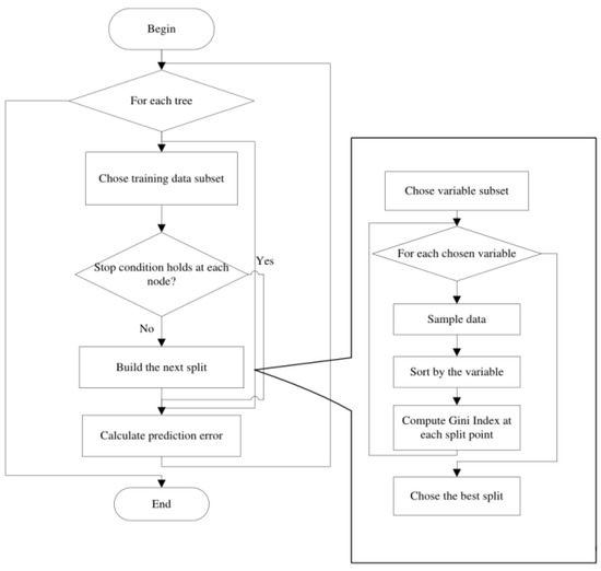 The random forest is a bagging and a decision tree-based machine learning method [26]. Assume that there are N samples in the training set. The bootstrap method is used to select a sample at each iteration from these N samples randomly. To determine the splitting nodes in the decision tree, some features are selected randomly. The Gini index is computed to determine the optimal splitting node. These procedures are repeated until it cannot be further split. Finally, the above procedures are repeated and these decision trees form a random forest. Figure 9 shows the process for the formation of the random forest.