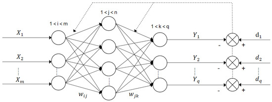 A multi-layer feedforward neural network consists of one input layer, one or more than one implicit layer, and one output layer. The implicit layer is also called the hidden layer. Training the neural network is finding the parameters in the neural network. The BP neural network is a neural network with its parameter trained by the error reverse propagation algorithm. In particular, the training composes of two major steps. The first step is the forward propagation of the signal and the second step is the BP of the error. For the first step, the input at the input layer is processed layer by layer and yields the output at the output layer. For the second step, if the output at the output layer does not match the desired output, then the error is back-propagated to the input. That is, the output is transmitted from the output layer back to the input layer through the hidden layer based on the error between the desirable output and the actual output. Here, the error is shared to all the nodes in all the layers. The weights and the thresholds of the nodes are updated via the fastest descent-based learning rule so that the total error in all the nodes is minimized. Figure 10 shows the diagram of the BP neural network [27].