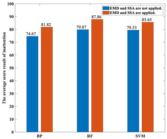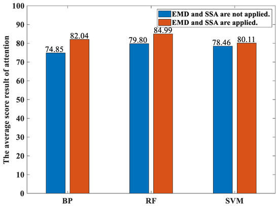 The advantage of our proposed method is the ability to perform a subjective and effective attention assessment of the participants when conducting various activities. In particular, this paper proposes a classification method for performing the regression task so that it is not required to have reference values from medical officers. First, FFT is employed for performing denoising. Then, EMD is applied to remove the underlying trend. Next, SSA is employed to increase the total number of components for performing feature extraction. After that, three different types of classifiers, namely the random forest-based classifier, the SVM-based classifier, and the BP neural network-based classifier, are employed for performing the classification. Finally, the percentages of the classification accuracies are employed as the score for concentration or for immersion. The computer numerical simulation results show that the average percentages of the classification accuracies over both 12 participants and over three classifiers yielded by our proposed method are higher than those yielded by the traditional methods for all the activities as well as for both the concentration state and the immersion state. Moreover, it is found that the highest score recorded in the concentration state yielded by our method is 100. This demonstrates that our proposed method yields a better classification performance. In addition, there are similar sorting orders of the activities yielded by both our proposed method and the traditional methods for both the concentration state and the immersion state. This demonstrates that our proposed method is reliable. Furthermore, as it is required to pay more attention when performing the reading activity and the doing computer exercise activity compared to performing the eating activity and the playing toy activity, our obtained results are consistent with this result. Hence, our obtained results are reasonable. Moreover, it is found that it is not necessarily true for the average percentages of the classification accuracies over both these 12 participants and over these three classifiers for performing the various activities yielded by both our proposed method and the traditional methods under the concentration state to be higher than those under the immersion state. Finally, it is found that the random forest-based classifier yields the highest average percentages of the classification accuracies compared to the SVM-based classifier and the BP neural network-based classifier for both the concentration state and the immersion state as well as for both our proposed method and the traditional method.