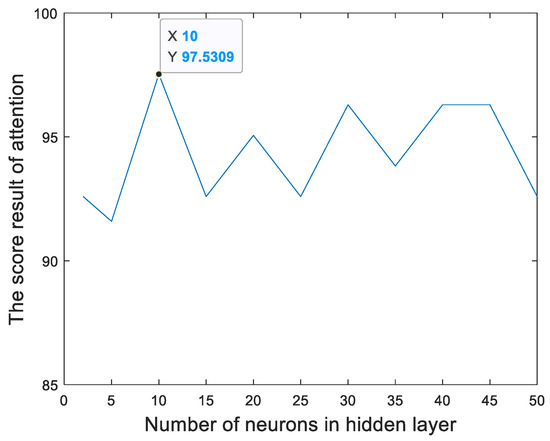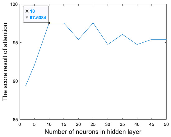 Figure 13 and Figure 14 show the relationships between the percentage of the classification accuracy and the total number of neurons in the hidden layer of the BP neural network in our proposed method trained using the EEGs acquired from Hejian performing the reading activity under the concentration state on the first day and on the second day, respectively. It can be seen that the highest percentage of the classification accuracy is yielded when 10 neurons are used in the hidden layer of the BP neural network regardless of whether the EEGs are acquired on the first day or on the second day. Hence, this paper employs 10 neurons in the hidden layer of the BP neural network.