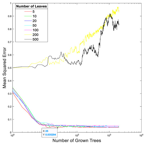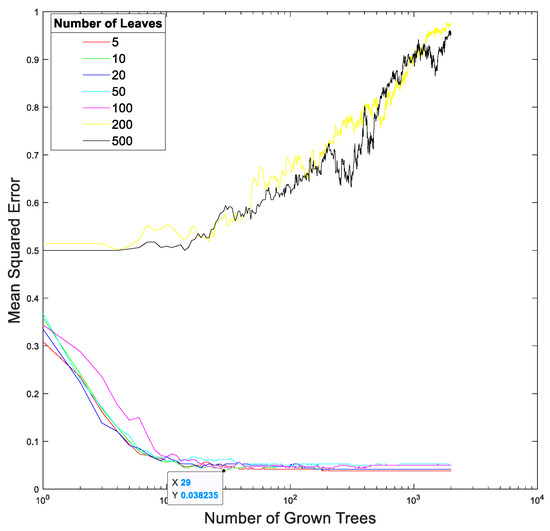 The relationship between the mean squares error and the total number of trees at different total numbers of leaf nodes in the random forest in our proposed method trained using the EEGs acquired from Hejian performing the reading activity under the concentration state on the second day.