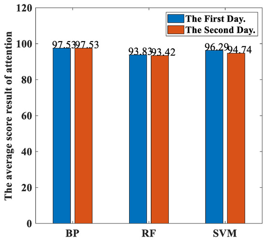 Figure 17 shows the percentages of the classification accuracies yielded by our proposed method with three different classifiers trained using the EEGs acquired from Hejian performing the reading activity under the concentration state on both the first day and the second day. It can be seen that the percentages of the classification accuracies trained using the EEGs acquired on the first day are similar to those trained on the second day for all three classifiers. Hence, the dates of the measurements can be ignored for performing the classification.