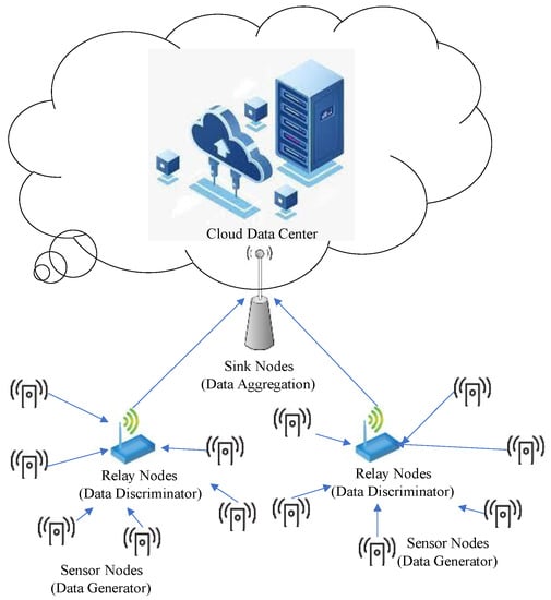 Figure 1 shows the general architecture of a WSN with sensor nodes in coverage areas. The sensor nodes generate data and transmits it to the relay nodes. The relay nodes will do preliminary processing that discriminates the correctness and usefulness of the data and further transmit it to the sink nodes. The sink node will aggregate data from relay nodes and do more advanced processing, such as classification. Finally, the data that needs to be applied or stored will be sent to the cloud data center. Each node communicates with higher-level nodes to transmit collected data through network interfaces. The location of higher-level nodes is determined according to the range of the sink or relay nodes, which gathers data from lower-level nodes. Network data are usually processed by the sink nodes or relay nodes, which only sends data that is relevant to the user. High-level nodes are located closer to the cloud data center and consume more energy than lower-level nodes due to their high usage for data aggregation []. Thus, sensor nodes optimize several variables, including the amount of data flow, the transmission power level, and the activation of each sensor to minimize energy consumption.