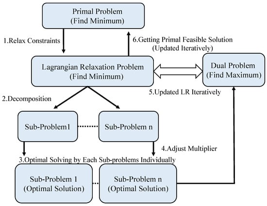 In this section, the optimal solution proposed in this study will be introduced within four subsections, including 4.1 the Lagrangian Relaxation method, the chosen optimization method, and Figure 3 shows the procedure flow chart of LR; 4.2 reformulation for LR optimization solution to reformulate the proposed mathematical model to make it so it can be decomposed into subproblems; 4.3 the solution of LR subproblems, which describes the solution approach of the LR subproblems; 4.4 obtaining the primal feasible solution, which introduces the proposed primal feasible solution and the process was shown in Figure 4.