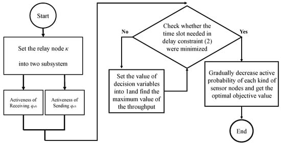 When , and . The time slot required in delay constraint (2) is minimized. When throughput constraint (5) is violated, the value of the decision variable can be set as 1 to obtain the maximum throughput value. After adjusting the decision variables, we gradually decreased , and to optimize the objective value for the primal problem and maintain the feasibility of the solution. The flow chart of the primal feasible solution is shown in Figure 4.