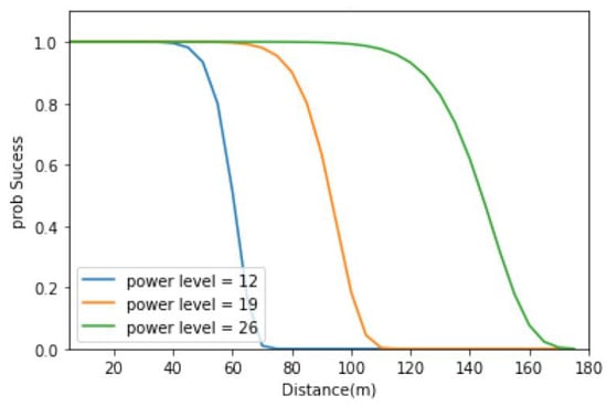 In order to implement the transmission probability, this study used the energy consumption characteristics of MICA2 motes [] equipped with CC1000s []. Mica2 motes are the most commonly used sensor nodes in experimental WSN research due to their favorable energy dissipation properties [], and CC1000 is a small electronic device used to transmit and receive radio signals between two devices, and a data cited from the above literature on the different distance between different sensor nodes were tested. Figure 5 shows the probability of successful transmission in three different SNR noise powers (power levels) based on the model developed by this study and the transmission data will be applied in the following experiments.