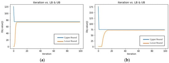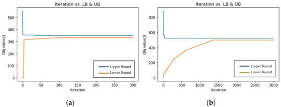 A subsequent experiment was conducted to investigate the performance of the tree structure WSN model. The distance between nodes was 30 m. Each subtree had two sensor nodes (v), and the number of subtrees (n) was five, Figure 7a. The timeout interval τi was set to 10 time slots. Tθi,ζ was set to a tight value of 1001. Results are shown in Figure 7a,b and Table 4. The blue line represents the Upper Bound (Primal Feasible Solution, the proposed solution in this study) and the orange line represents the Lower Bound (LR Solution). The unit of the horizontal axis is the number of iterations, and the unit of the vertical axis is the objective value as watts. The experiment was also conducted using three sensor nodes in each subtree (v) and eight subtrees (n) for a bigger scale, Figure 7b, and Tθi,ζ was set to 3000.