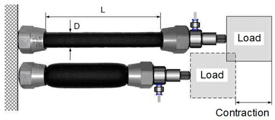 The pneumatic muscle is a flexible traction actuator powered by gas pressure. It consists of an inflatable and flexible rubber tube and two connecting flanges along which a mechanical load is pulled. PAM operates at positive pressure and contracts when pressurized, generating a load-bearing capacity at its ends during this contraction, as can be seen in Figure 1. The compressed gas-powered artificial muscle actuator contracts longitudinally when stretched radially, converting the radial expansion force into an axial contraction force. PAMs are contractile devices that can generate translational and unidirectional motion. Normally, the maximum contraction of muscle actuators is about 25% of the nominal length.