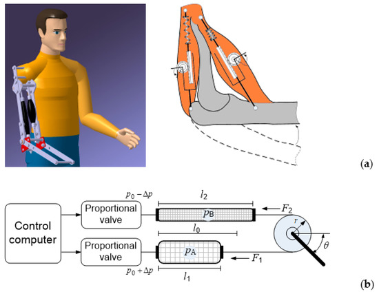 To move the load in both directions, an antagonistic coupling should be used. Two antagonistic PAMs can drive a rotational element in a similar manner to how the skeletal biceps and triceps rotate the forearm around the elbow, as shown in Figure 2a. Figure 2b shows a schematic diagram of the control of a single-joint manipulator arm actuated by a bi-muscular drive system.