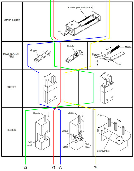 Morphological matrix with four considered variants (V1–V4) for manipulator construction.