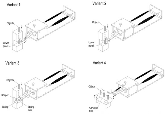 After defining the main parts of the system, particular attention was given to the development of subsystems for supplying objects, which is shown in Figure 7.