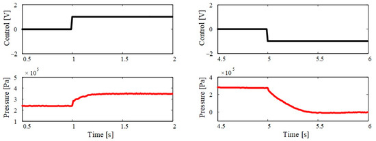 where Km is the transfer gain and τm is the time constant. From the reference step change illustrated in Figure 8, the time constant of the process can be approximated numerically to the value τm ≈ 0.05 s in the case of pressure increasing, and τm ≈ 0.1 s in the case of pressure decreasing. The forward gain Km is estimated numerically to the value Km ≈ 1.1 × 105 Pa/V. These values are used in the controller design procedure.