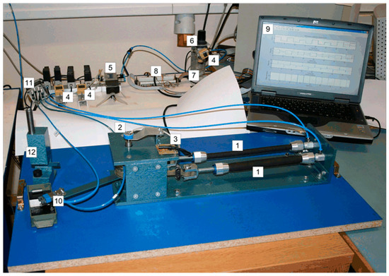 Photograph of the experimental equipment. Legend: 1—Pneumatic muscles, 2—Rotary potentiometer, 3—Voltage reference card, 4—Pressure sensors, 5—Proportional control valve, 6—Filter-regulator unit, 7—Manually operated valve, 8—Electronic interface, 9—Control computer with DAC card, 10—Gripper, 11—High-speed on/off solenoid valve, 12—Feeder.