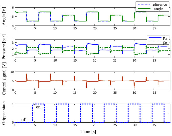 The experimental results point out that the stable and well-damped response of the control system is obtained for both directions of the manipulator arm motion. In the lower part of the figure, the status of the gripper during the manipulator-arm movement is shown. When the arm is in the appropriate position, the gripper opens or closes by using an electromagnetic on/off valve, which allows the capture or release of the work pieces. The principle of operation of the practically realized manipulator driven by a pair of artificial pneumatic muscles can be seen in the Supplementary Material.