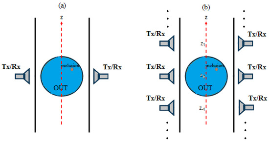 In conclusion, it must be stressed that the implementation of such an approach, in addition to requiring almost identical antennas and a perfect aligning of them, requires a perfect synchronization between the acquisition system and the movement of the OUT in order to acquire the scattering parameters exactly at the mirror positions, z−n and zn, along the z-axis. In any case, the knowledge of the displacement is still required to perform the imaging as this information is needed to evaluate the right Green’s functions to be employed in the inversion algorithm (see Section 2.4).