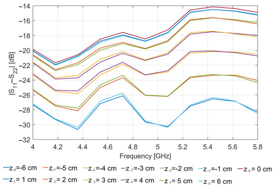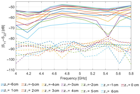 Figure 5 shows the magnitude (in dB) vs. frequency of the difference between S11(zn) and S22(zn) simulated at the two antenna ports, for each of the positions zn at which the OUT is probed, when the glass inclusion is present in the OUT (solid lines). For comparison, Figure 5 also reports the same plots obtained when no inclusion is present (dashed lines).