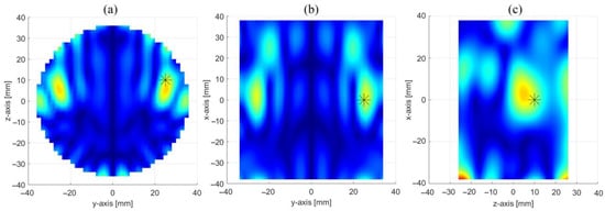 Figure 6 shows the achieved reconstruction in three orthogonal cut planes crossing the center of the inclusion. From panel (a) one can clearly note the presence of two main spots: a first one, at the same position of the inclusion, representing the inclusion itself, and a second one, perfectly specular to the former with respect to the xz-plane, which is the “ghost” arising from the symmetrization introduced by the PSP-based approach (see Section 2.2.1 and Appendix A). As already stressed in Section 2.2.1 and Section 2.2.2, this ambiguity can be settled by exploiting other symmetries of the OUT and radiating system, such as the one with respect to the xy-plane, exploited by the OSP-based approach. This will be shown in Section 3.3.