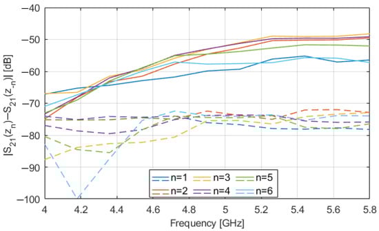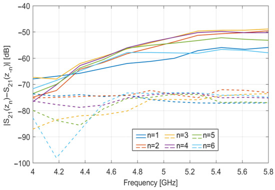 Figure 7 shows the magnitude (in dB) vs. frequency of S21(zn) − S21(z−n), for zn = 1 ÷ 6 cm, with (solid lines) and without (dashed lines) the glass inclusion in the OUT. The values of the difference obtained in presence of the inclusion are appreciably larger than those without it. Again, this result is due to the presence of the glass inclusion, which, in this case, destroys the symmetry of the OUT (and of the MWI system) with respect to the xy-plane, thus leading to a difference in the transmission parameters measured at the two mirror positions, zn and z−n, assumed by the OUT in moving along the z-axis. The same trend is observed for |S11(zn) − S11(z−n)| and |S22(zn) − S22(z−n)| but not reported for the sake of brevity.