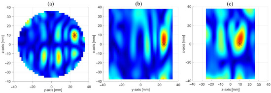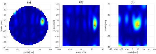 Reconstruction of the inclusion through the PSP-based approach: images in three orthogonal cut planes crossing the center of the inclusion (stars give the position of the inclusion), i.e., (a) x = 0 cm cut plane, (b) z = 10 cm cut plane and (c) y = 25 cm cut plane.