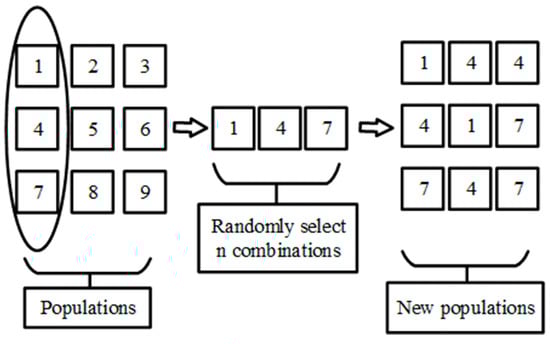 In the assisted convergent evolution scheme, improved tournament and natural selection mechanisms are used to improve the ability to jump out of the local optimum. The traditional tournament selection is to randomly select a number of offspring individuals from the current optimized local position each time, then rank the fitness values of the selected offspring individuals and take the best value of the fitness value into the offspring population. We improve it by randomly selecting several elements of child individuals each time, with the population size as the boundary and the first column of the population as the target, and then recombining these elements into several new individuals. The specific principle is shown in Figure 1.