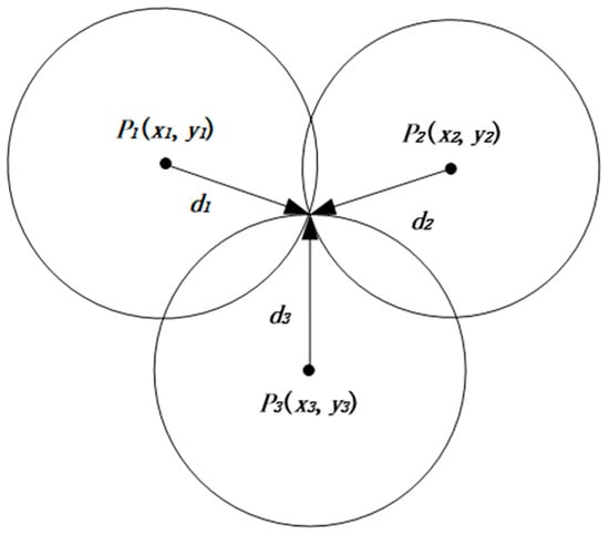 In RSSI-based localization algorithms, the position of UNs can be estimated from the received signal strength [64]. The trilateral localization algorithm is a commonly used node localization algorithm, which implements the basic principle of localization as follows: three ANs are located as , , and if there exists an unknown node located as and their distances are known as , , and . Then, the coordinate positions of the three ANs and the corresponding communication radius are used as the center and radius to draw three circles respectively, and their only intersection point is the unknown node position. The specific principle is shown in Figure 2.