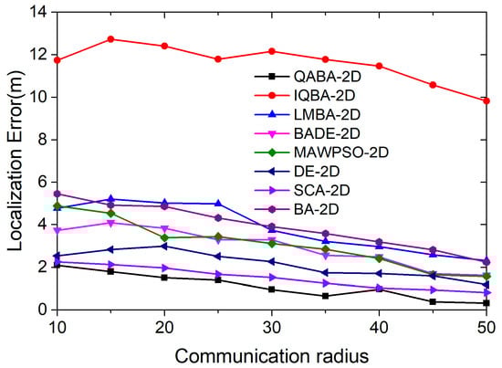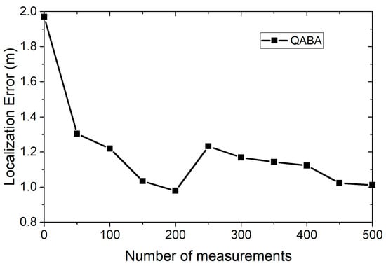 According to the localization error curves of the different number of measurements in Figure 3, we can see that the optimal localization error of the algorithm has been approached at the number of 150; thus, we choose the number of 150 for each measurement. In addition, there is the problem that the localization error increases when the number of measurements increases in Figure 3. This is because the presence of too few anchor nodes near the unknown nodes increases the localization error, and the noise we add in each experiment also increases the localization error, while the same phenomenon can occur if our QABA runs unstably.