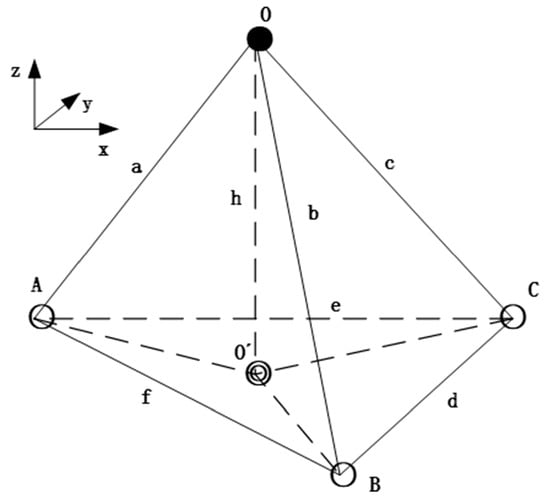 The z-value of UNs is susceptible to accuracy deviations due to the height of the spatial tetrahedron. Therefore, from the principle shown in Figure 3, the height of the tetrahedron is updated using the Pythagorean theorem, as follows.