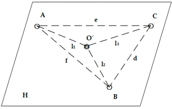 The coordinates of the vertical projection point of the unknown node above the plane H can be found using the trilateral localization algorithm. The position of the point on the plane H is shown in Figure 5, where is the distance from the point to the three ANs.