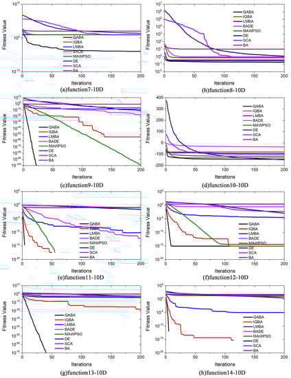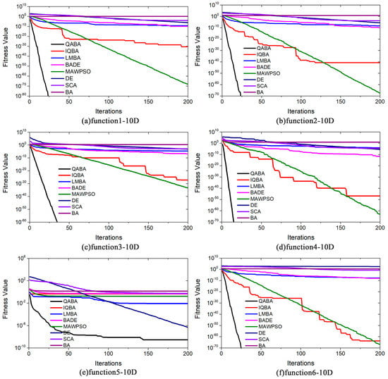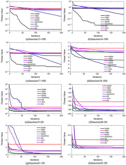As shown in Table 2, QABA converged to near the minimum for all 22 tested functions, and 12 functions converged to the theoretical optimum. In addition, 13 functions had better results compared to IQBA and LMBA, and 9 functions had similar results. Compared with BADE, 14 functions had better results, and 8 functions had similar results. Compared with MAWPSO, there were 12 functions with better results and 10 functions with similar results. Compared with DE and BA, there were 15 functions with better results and 7 functions with similar results. Compared with SCA, there were 16 functions with better results and 6 functions with similar results.