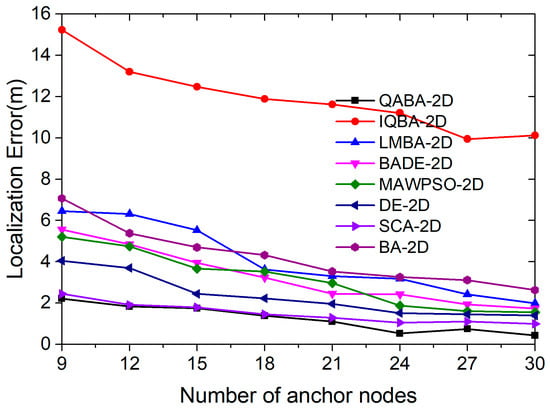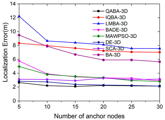 An appropriate amount of anchor nodes can help the algorithm select better anchor nodes for localization, thus improving the localization accuracy. In 3D localization, if the anchor nodes are selected closer to the unknown nodes and they form a more regular spatial tetrahedron, the localization error will be smaller. To investigate the influence of the number of anchor nodes on the localization accuracy, we set the distribution of the number of anchor nodes in the range of 5–30 and the noise variance at 0.5 in our experiments, and 100 unknown nodes were localized. Among them, each anchor node number variable was run 30 times individually, and the average value of the localization errors of 30 times was taken to compare the localization performance of QBAB-3D with other localization algorithms. The localization errors are shown in Figure 14.