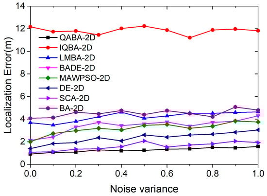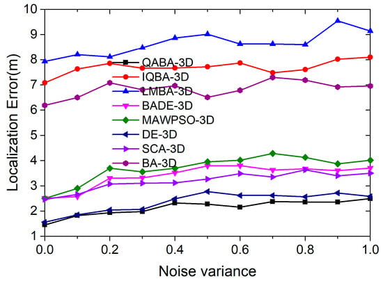 Similar to 2D localization, we set the range of noise to 0.1–1 in our experiments to investigate the effect of noise on localization accuracy under different path loss. The number of anchor nodes was 15, and the number of unknown nodes was 100. Each noise variable was run 30 times continuously, and the average of 30 times was taken to predict the performance of QABA-3D with other localization algorithms. The localization error curves are shown in Figure 15.