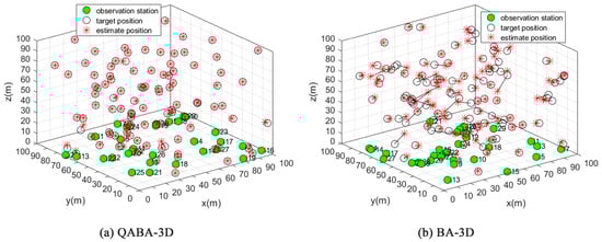 From Figure 13, the positions of 100 UNs were successfully located by QABA-3D and show excellent localization accuracy. In contrast, only a very small number of nodes were precisely located by BA-3D, and the overall localization accuracy was poor. The experiment illustrates that QABA-3D still has better localization performance and higher accuracy than the source BA-3D in 3D node localization, thus further demonstrating the effectiveness of QABA’s auxiliary strategies, such as improved structure and tournament.