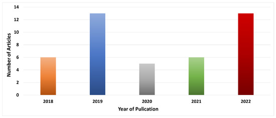 The primary information of the included papers [90,91,92,93,94,95,96,97,98,99,100,101,102,103,104,105,106,107,108,109,110,111,112,113,114,115,116,117,118,119,120,121,122,123,124,125,126,127,128,129,130,131,132] is shown in Table 1. Based on the data shown in Figure 4, we can observe that 13.95% of the total papers were published in 2018 [93,103,111,116,120,124], while 30.23% were published in 2019 [90,92,94,95,99,101,102,104,114,117,119,122,127], 11.64% were published in 2020 [91,96,113,118,121], 13.95% were published in 2021 [100,112,115,123,125,128], and finally, 30.23% were published in 2022 [97,98,105,106,107,108,109,110,126,129,130,131,132]. We note that blockchain technology research is considered new as it will require further development and testing in a real-time environment. In addition, the implementation of such systems is not easy. It requires more time than traditional architectures, which explains why blockchain-based approaches are not widely used in some research areas. However, many approaches that include blockchain technology in their designs are achieving promising results. Overall, 37.21% of the proposed schemes originate from China [92,94,95,96,97,102,104,105,113,114,119,124,125,128,129,132], and 62.79% are distributed between 14 countries [90,91,93,98,99,100,101,103,106,107,108,109,110,111,112,115,116,117,118,120,121,122,123,126,127,130,131]. Most of the included papers are published in journals, which result in 79.07% [90,91,94,96,97,98,99,100,102,104,105,106,107,108,109,110,111,112,113,114,115,118,119,121,122,123,125,126,127,128,129,130,131,132], while 16.28% are published in conferences [92,93,95,101,103,116,120], and 4.65% are published in book and symposiums [117,124]. We included a detailed description of the publishers (name of journal or conference) to address the common databases used. Overall, 51.16% are published in the IEEE database [91,92,96,97,100,101,102,104,105,106,107,108,110,111,116,119,120,123,124,127,128,132], 20.93% are published in Elsevier [94,103,112,113,114,117,118,121,122], 13.95% are published in MDPI [98,99,109,115,130,131], 6.98% are published in Springer [93,95,125], and 6.98% are published in Wiley/Hindawi [90,126,129].