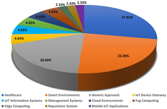 The objective and development level are presented in Table 2. Based on the data shown in Figure 5, our results show that 27.9% of the included studies focused on the healthcare domain [99,100,101,102,103,104,105,106,107,108,109,110], while 18.6% focused on proposing generic approaches [91,92,93,94,95,96,97,98]. From the total percentage of the included articles, 23.25% aimed to target smart environments applications divided into 9.3% for smart home applications [120,121,122,123], 6.98% presented systems designed to target smart cities [116,117,118], and there were 2.32% of each of the following: smart factory [119], smart traveling [124], and smart agriculture [130]. Furthermore, the IoT device gateway [111,112], IoT information systems [113,114], management systems [131,132], cloud environment [128,129], and fog computing [125,126] have carried out 4.65% for each separate application. Finally, the rest (≈6.99%) aimed to address edge computing [90], mobile IoT applications [115], and reputation systems [127].