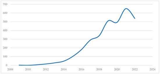 Making use of the analysis tools of the WoS platform, Figure 3 shows the distribution in time of the jobs retrieved with our search sentence (3201 records) since the beginning of the popularisation of the term IoT in 2009 [133], having obtained only 2 works published in that year. The appearance of articles related to IoT is constantly growing, although in 2020 there was a decrease in the number of publications of research papers, probably due to the COVID-19 pandemic, which led to health problems and restrictions on the mobility of the population [134,135]. However, this growth resumed in 2021. It should be noted that from 2022 onwards, papers published up to the date of submission for publication of this article have been considered.